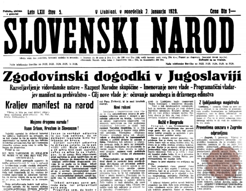 Nenehno krizo je kralj skušal tokrat rešiti na drugačen način in je 6. januarja 1929 izdal izšel manifest, ki je ugotavljal, da »med narodom in kraljem ne more biti več posrednika«. Razveljavil je vidovdansko ustavo, razpustil skupščino in stranke ter za mandatarja vlade, neposredno odgovorne njemu, imenoval generala Petra Živkovića. Obračunal je tudi z dvigajočimi se političnimi nasprotniki, kot so bili makedonski VMRO in hrvaški ustaši pod vodstvom Anteja Pavelića, ki so zahtevali samostojnost Makedonije in Hrvaške, ter Komunistična partija Jugoslavije, ki je pozvala k oboroženemu uporu.