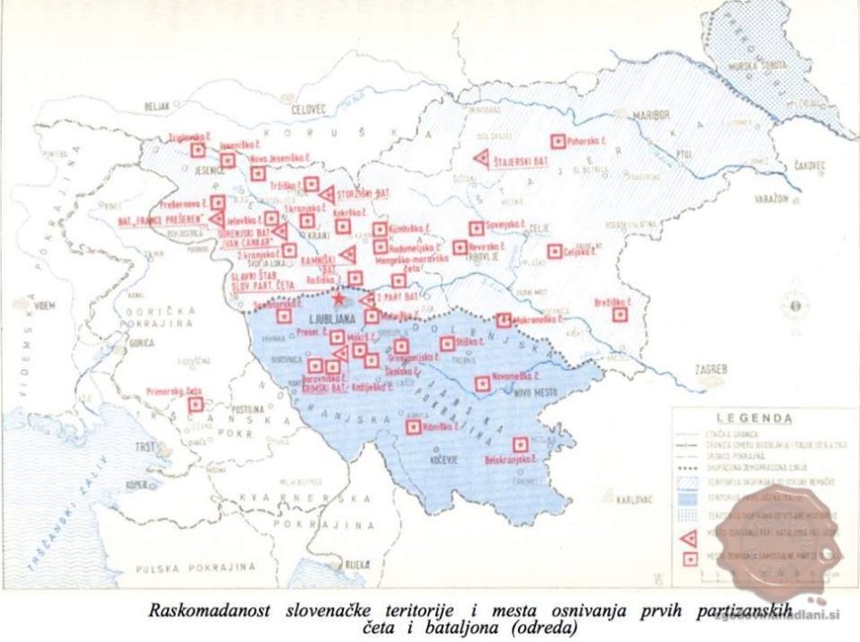 Na fotografiji: razkosanje slovenskega ozemlja in lokacije ustanovitev prvih partizanskih čet in bataljonov, FOTO Zdravko Klanjšček – NOB v Sloveniji 1941 – 1945 (1984).