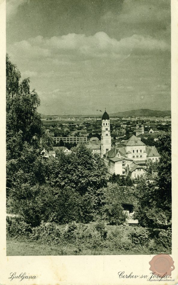 Jezuitska cerkev sv. Jožefa na ljubljanskih Poljanah med obema svetovnima vojnama. Cerkev so zgradili leta 1914, blagoslovili pa šele sedem let kasneje. Po uradnih podakih so jo skupaj s pripadajočimi objekti po vojni nacionalizirali, v njej je prostore dobila slovenska filmska hiša Triglav film, po njenem stečaju leta 1966 pa Viba film. Leta 1996 so cerkev vrnili jezuitom.