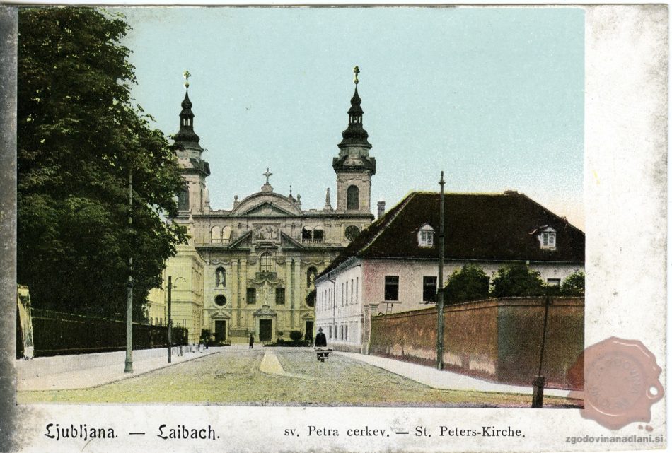 Pogled z Trubarjeve ceste na baročno cerkev Svetega Petra v Ljubljani.